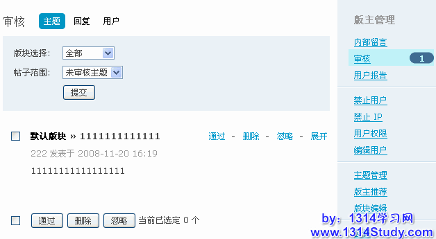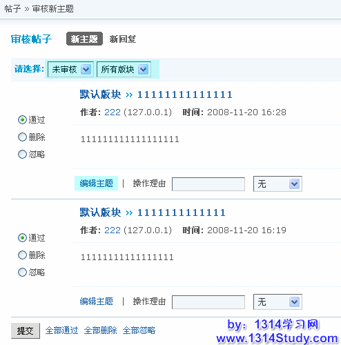 3)批量操作:可以点击下面的全部删除,全部通过,全部忽略进行新主题的批量操作。也可以点击每个需要审核的主题左边的单选框进行单个审核。