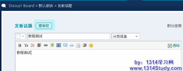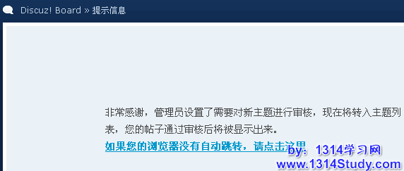 按照说明设置好后,会员发表新帖后将会出现提示信息,设置需要审核新主题,当会员发表帖子时,可以看到提示,如图所示: