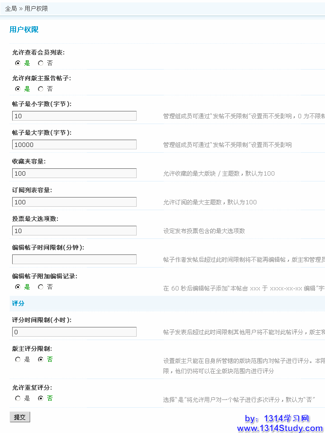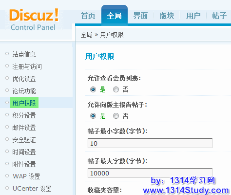 Discuz! 后台全局里的用户权限设置是对所有用户的全局设置项。下面分别说明一下每个设置项。