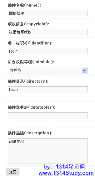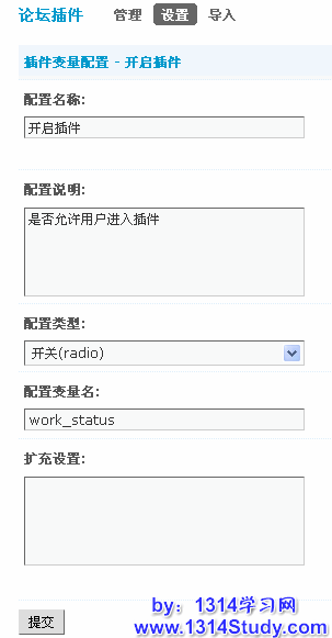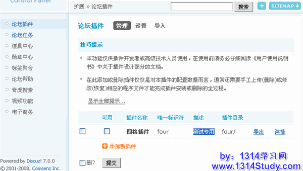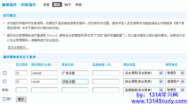 后台调用(后台菜单):可在后台插件设置中为此插件增添一个管理模块,模块文件名指派为“./plugins/插件目录/插件模块名.inc.php”,由 admincp.php 调用此模块。