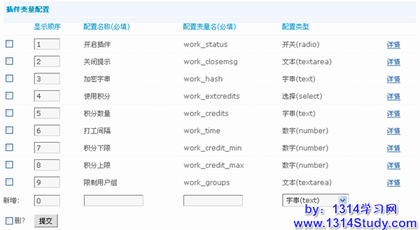 变量的增加和前面插件的增加类似。例如增加一个“开启插件”的变量设置,点“详情”,会看到如下图所示的界面。按照每一项的右边的提示就可以完成一个变量的设置。