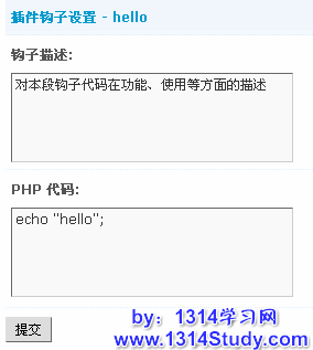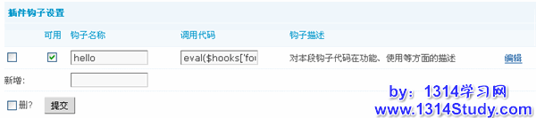 点“编辑”,在打开的页面中,填写“钩子描述”和需要执行的“PHP代码”,如下图。然后点“提交”。