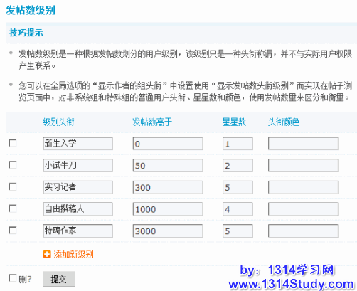 请您根据站点的具体情况,修改级别头衔、每个级别的发帖数限制、每个级别的星星数和不同级别显示的颜色。