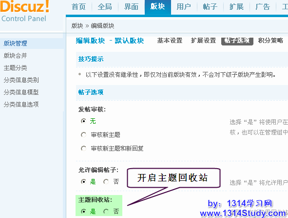 那这么好的功能怎样在 Discuz! 的后台开启呢?首先这个功能是跟每个版块关联的,所以每个版块都有此项设置,即可以控制哪些版块开启主题回收站的功能。在版块 => 版块管理 => 编辑要开启主题回收站的版块 => 帖子选项中,就可以设置这个版块开启或者关闭回收站。如下图所示: