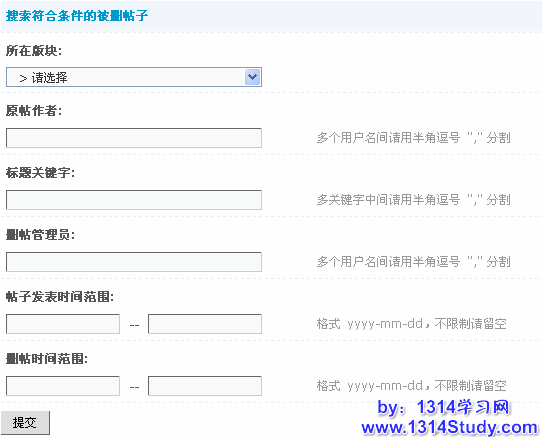 根据这些条件,可以搜索到主题回收站里的帖子,全部留空的话就是显示所有回收站内的帖子。如下图所示: