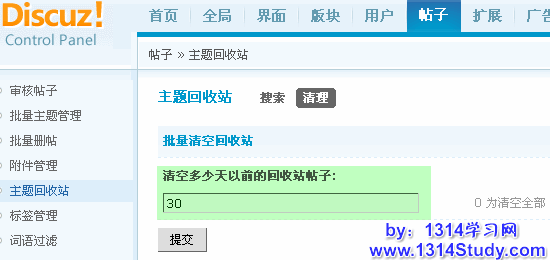当回收站里面存在大量垃圾帖子的时候,还有个更快捷方便的操作可以批量清空回收站里的帖子,这个就是“批量清空回收站”功能。可以在后台 => 帖子 => 主题回收站 => 清理找到这个功能。只需要填写一个清空的时间,就可以方便快捷的清空多少天以前的回收站的帖子了,填0为清空全部的帖子。如下图所示: