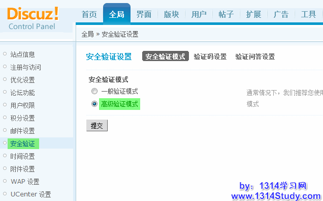 灌水机已经成了目前很让站长头疼的事情,为此,Discuz! 7.0.0 设计了强大的防灌水机制,两种安全级别加上验证码和验证问答,使得绝大多数的灌水机望而却步。下面详细讲解下其使用方法,进入系统后台 => 全局 => 安全验证。