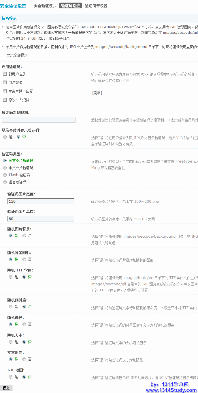 验证码可以避免恶意注册及恶意灌水,请选择需要打开验证码的操作。启用验证码的操作有四个选项:新用户注册、用户登录、发表主题与回复、修改个人资料。