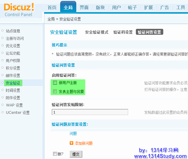 站长可以在“新用户注册”或者“发表主题与回复”的时候启用验证问答。