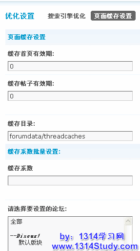 Discuz! 页面缓存的结构就是这样的,那究竟是在哪里设置的呢?进入到 Discuz! 论坛的管理后台,点击全局 => 优化设置 => 页面缓存设置,就可以看到如图的界面