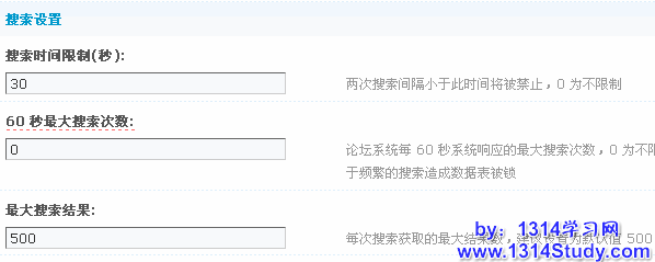 论坛系统每 60 秒系统响应的最大搜索次数,0 为不限制。注意:如果服务器负担较重,建议设置为 5,或在 5~20 范围内取值,以避免过于频繁的搜索造成数据表被锁。