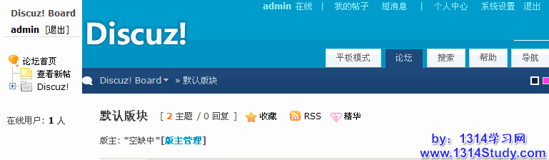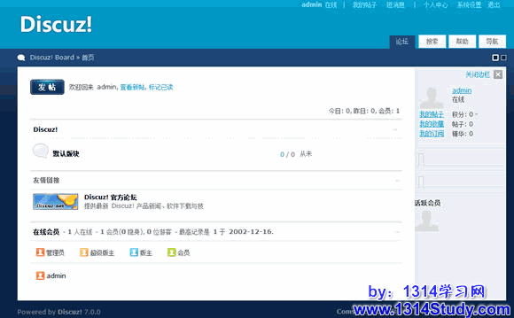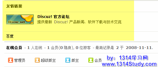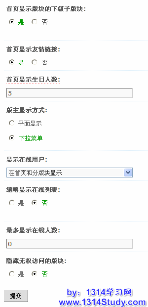 此功能可以设置论坛首页中的友情连接、下级子版块、在线人数等的显示设置。