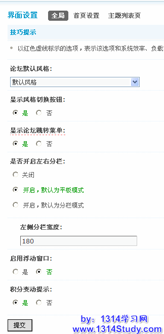 说明:这个功能主要涉及到与论坛的前台显示效果有关的一系列设置。下面主要介绍一下这个功能的使用方法和注意事项。