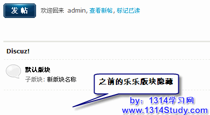 当对其中的一个板块设置了访问权限后,在设置“隐藏无权访问的版块”为“是”。再次浏览前台时,无权访问(例如:上图中乐乐的板块)的板块就被隐藏了,如下图所示: