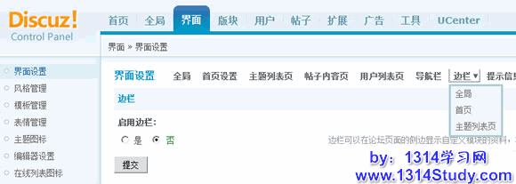 可以通过全局设置来选择论坛默认的模板和页面的分栏等,进入方法:后台 => 界面 => 界面设置 => 全局,如下图所示: