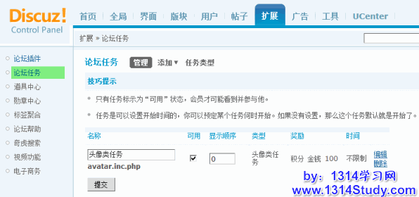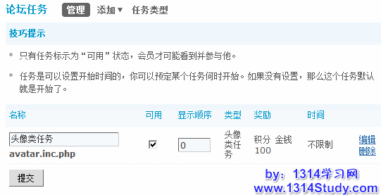 在上图的论坛任务列表中,可以直接更改论坛任务的名称、是否启用、显示顺序,然后点击“提交”保存更改。