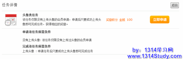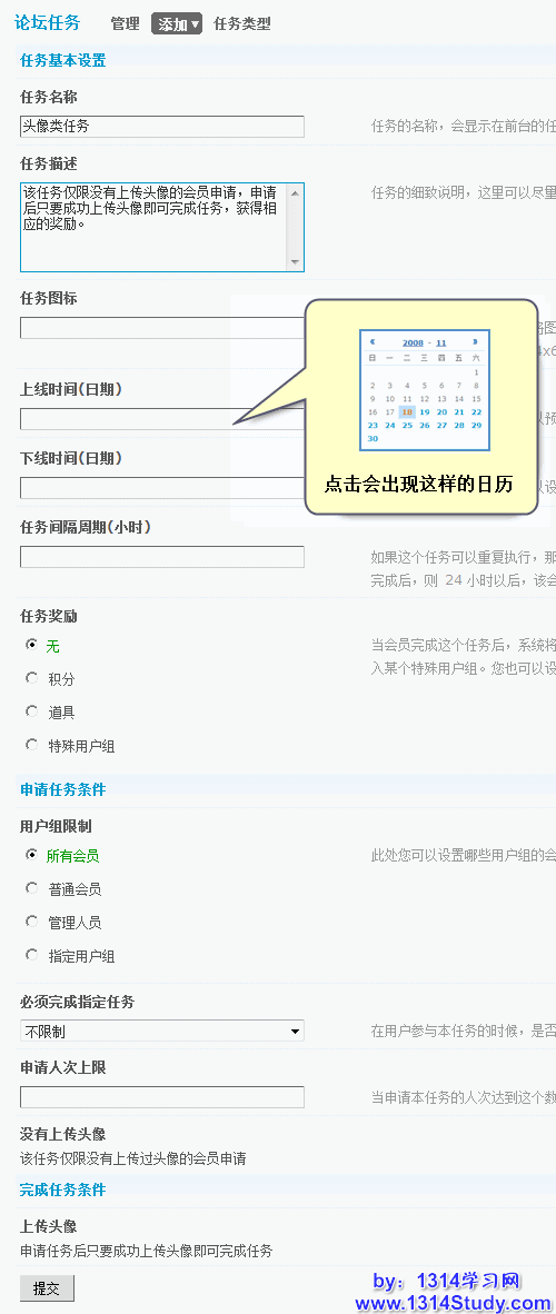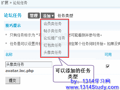 默认提供了五种论坛任务的类型,头像类任务、红包类任务、论坛推广任务、会员类任务、帖子类任务,选择其中一种,例如头像类任务,如下图所示: