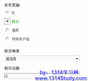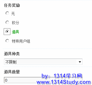 任务奖励:当会员完成这个任务后,系统将根据您的设置,自动为该会员颁发奖励。奖励的类型可以是积分、道具或者是将用户加入某个特殊用户组。您也可以设置这个任务没有任何奖励,不过这个任务对会员的吸引力就降低了。对于三种奖励的设置,如下图所示: