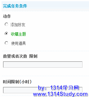 数量或者次数 限制:会员执行该任务动作的次数或者数量,比如发帖的数量,邀请好友的数量,收藏主题的数量等,达到这个数量则系统认为任务完成,否则为失败。数量最少设置为 1 。