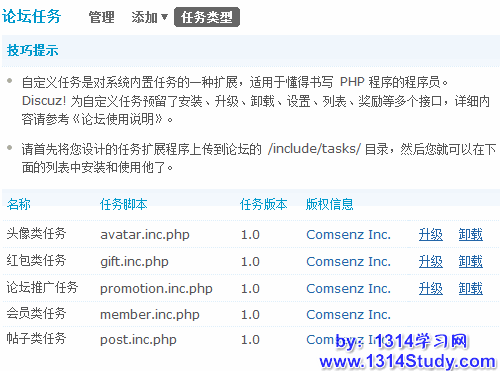 这里列出了所有可选的默认论坛任务类型,默认就是上文提到的五种类型,会员类任务和帖子类任务为不可卸载的任务类型,头像类任务、红包类任务、论坛推广任务为可卸载,可升级的任务类型。如下图所示: