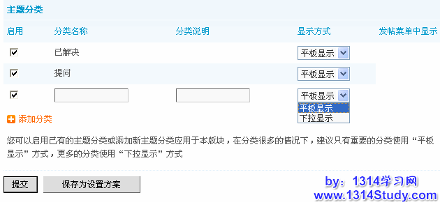 关于“平板显示”和“下拉显示”的说明:请选择您期望在本版块中使用的类别选项,如果本版块选择的分类较多,建议您使用“下拉显示”方式,只把重要的分类使用平板显示,以免分类显示太长,破坏页面。