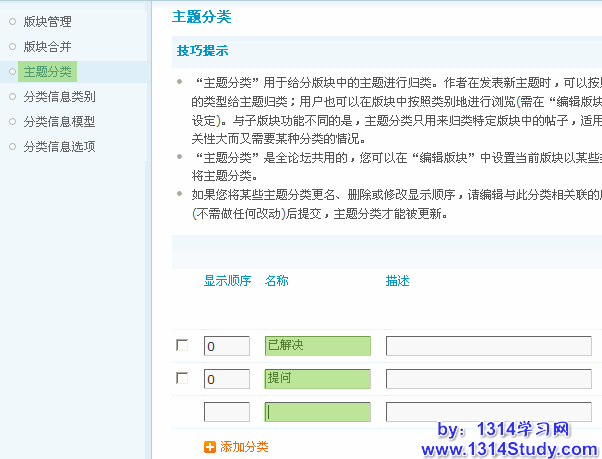 添加分类“名称”、“描述”及设置显示顺序后提交即可完成一个主题分类的添加,不过需要注意的是这里添加的主题分类默认是“不使用”状态,若要给某个版块使用该主题分类,还得进入相应版块的编辑版块页面选择“启用”,方法同 1)中所述。