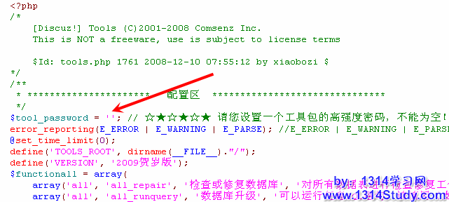 把 Tools 工具箱下载回来后,用记事本打开,大约在 11 行左右可以找到设置密码的地方,在下图所指的地方输入你要设置的密码,然后传输到论坛或者其他康盛产品的跟目录下,通过浏览器访问 Tools 工具箱就可以使用了。