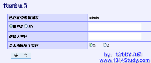 此功能可以帮助站长找回遗忘的管理员,如果应用和 Ucenter 的通信方式是基于 MySQL 进行的,在这个页面就可以完成管理员权限的提升、密码的更改、安全问答的去除等。