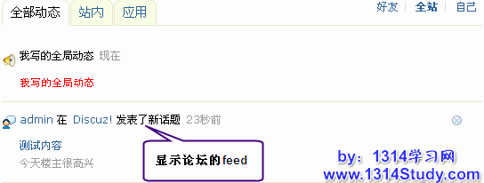 假设这里我只选择了普通主题,那么只有会员发布的普通主题帖这个动作会在 UCenter Home 的站点动态里显示。效果: