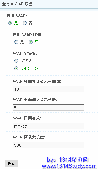 我们可以在论坛后台对 WAP 进行设置,首先进入论坛后台 => 全局 => WAP 设置,如下图所示就进入了 WAP 的设置界面。