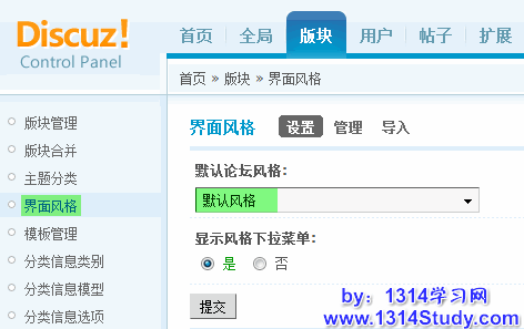 用管理员登录论坛后台 => 版块 => 界面风格 => 设置:“默认论坛风格”选择“默认风格”