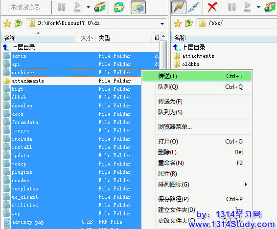 2、上传 Discuz! 7.0.0 (除 attachments 和 config.inc.php 文件外)的所有程序文件到服务器上