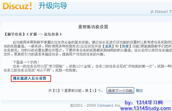 您可以点击“现在就进入后台设置”,来立即设置该功能;也可以点击“继续下一个功能”或“跳过”来跳过该功能的设置,以后设置。