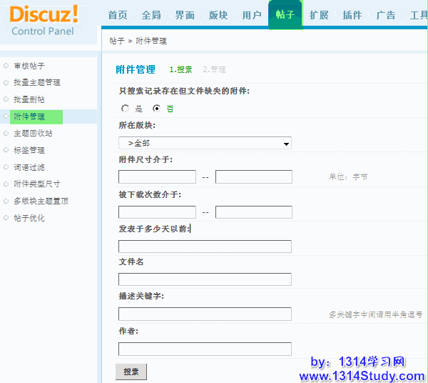 论坛自带了对附件的管理功能。通过这个管理功能,管理员可以根据条件搜索附件,对搜索到的附件进行删除、下载、打开附件所在主题,还可以对附件的数据表进行整理,将服务器上已经不存在的附件的信息在数据表中删除,减小附件表的数据量,进而增加附件检索的速度。