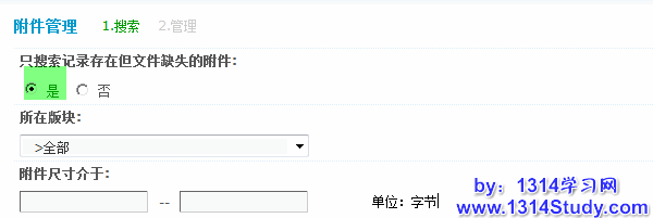附件尺寸介于:搜索介于某个尺寸的附件,单位为字节,不填写为不限制。