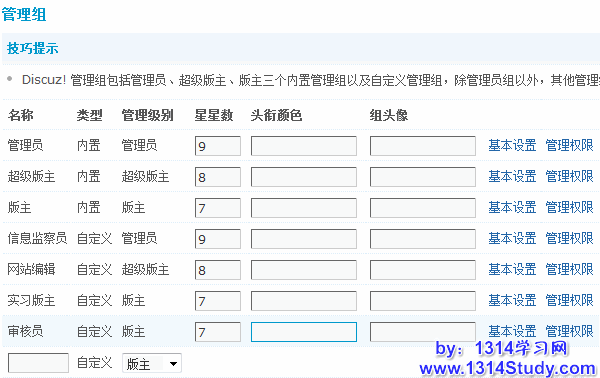 Discuz! 管理组包括管理员、超级版主、版主三个内置管理组以及自定义管理组,除管理员组以外,其他管理组均可详细设置管理权限。