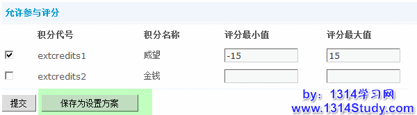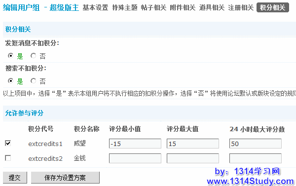 3)允许参与评分:允许该用户组用户在给其他用户评分的时候可以评哪种积分,以及可以评分的最大值与最小值,和24小时评分总量。