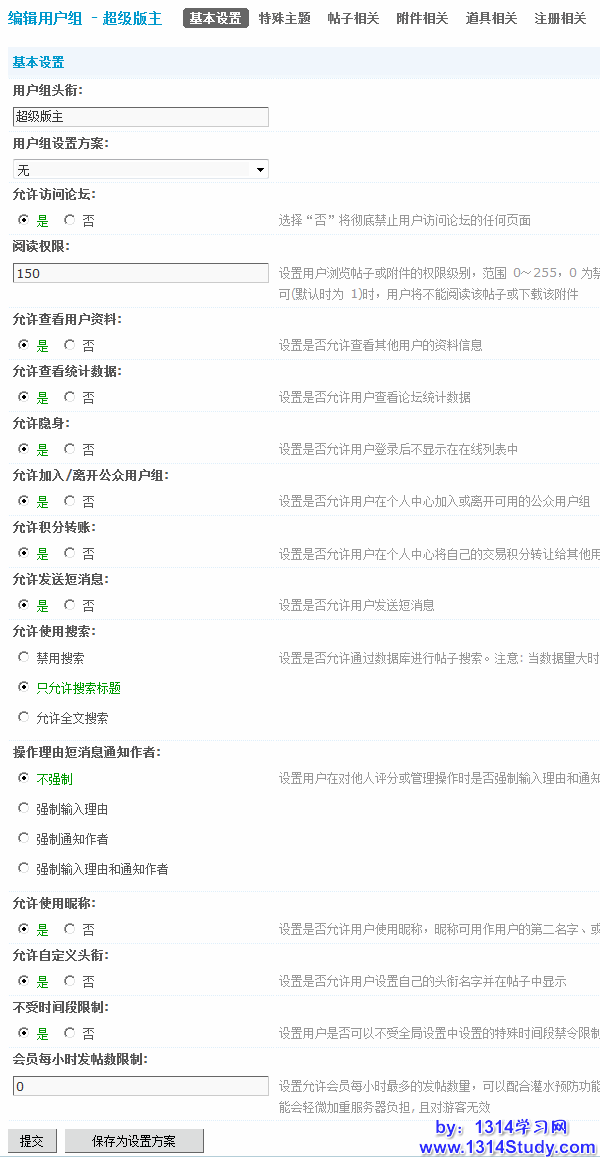 下面以超级版主为例,讲解一下管理组的各项设置。