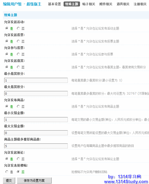 4)允许发起悬赏:选择“是”允许在论坛发布悬赏主题,悬赏使用交易积分。