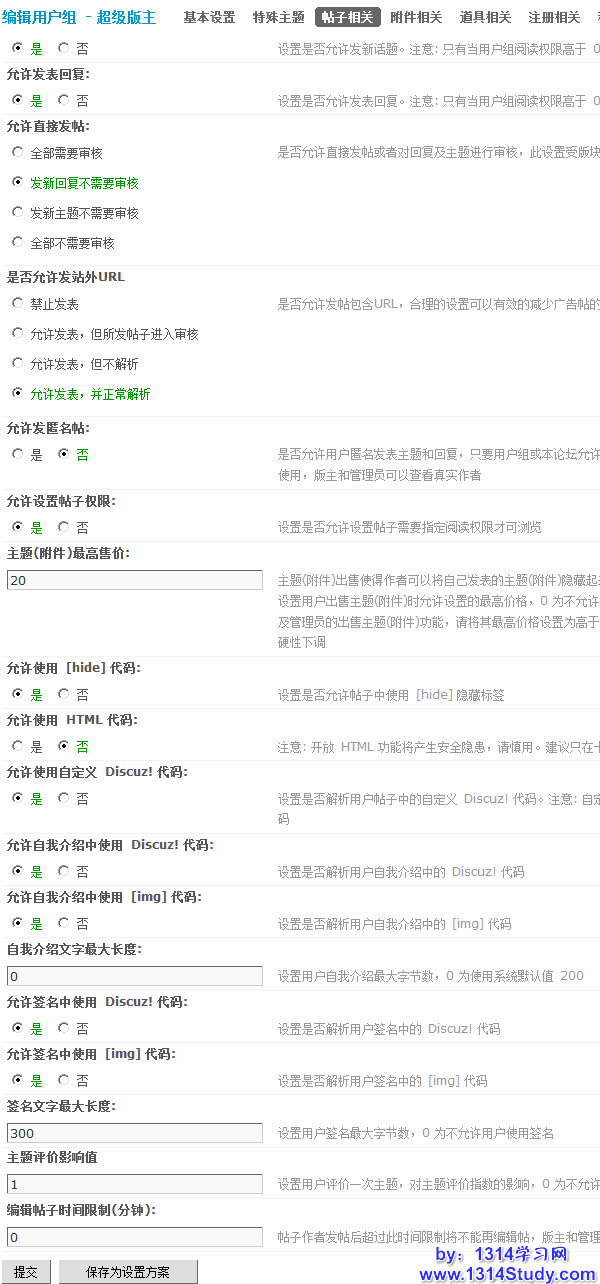 1)发帖不受限制:设置发帖是否不受灌水预防和最大字数等。