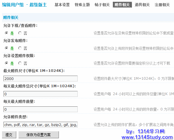 3)允许设置附件权限:设置是否允许设置附件需要指定积分以上才可下载。