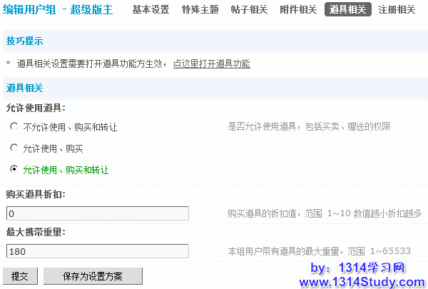 1)允许使用道具:是否允许使用道具,包括购买、使用、转让的权限。