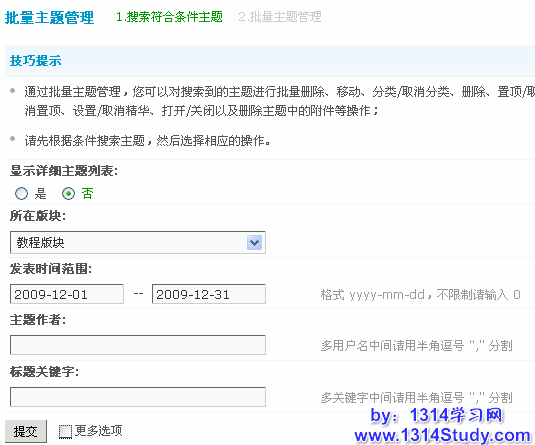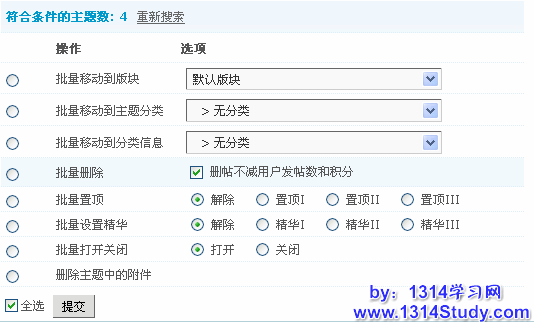 这个功能搜索出符合一定条件的主题,然后进行批量的操作。包括:批量移动到版块、批量移动到分类、批量删除、批量置顶、批量设置精华、批量打开关闭、删除主题中的附件。下面主要介绍一下这个功能的使用方法,进入系统后台 => 帖子 => 批量主题管理。