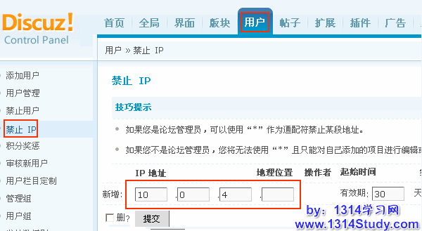 论坛后台 => 用户 => 禁止IP,如图
