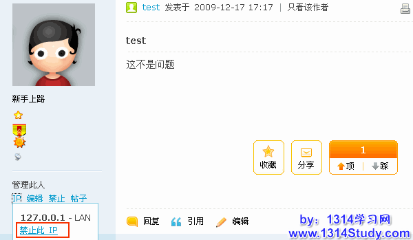 另外,管理员在前台查看帖子的时候,也可以对IP进行查看和禁止。如图所示: