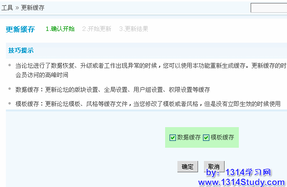 管理员可以更新数据缓存或者模板缓存,也可以同时更新二者。选定对象,然后点击“确定”按钮,即开始更新缓存。