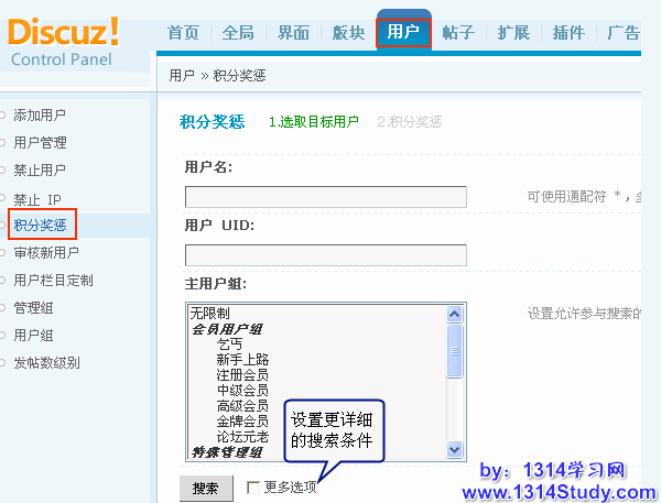 可通过用户名、用户UID、主用户组 搜索 目标用户