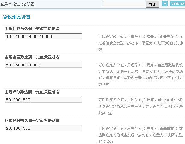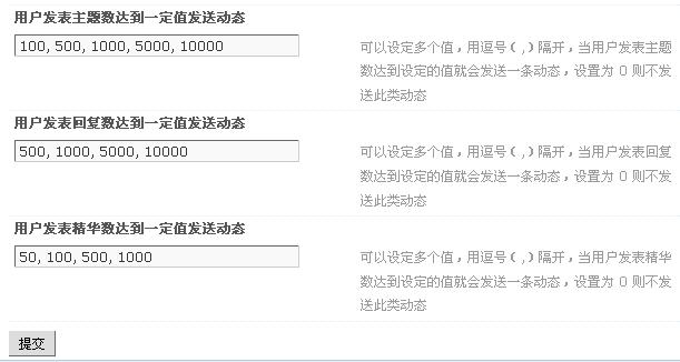 1、主题回复数达到一定值发送动态:可以设定多个值,用逗号(,)隔开,当回复数达到设定的值就会发送一条动态;