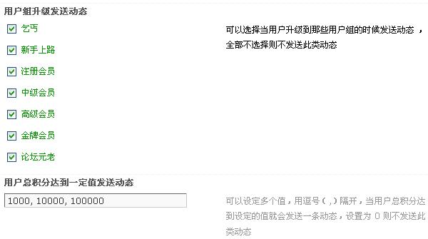 5、用户组升级发送动态:可以选择当用户升级到那些用户组的时候发送动态 ,全部不选择则不发送此类动态;