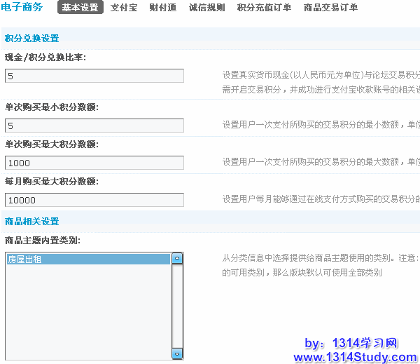 现金/积分兑换比率:设置真实货币现金(以人民币元为单位)与论坛交易积分间的兑换比率,例如设置为 10,则 1 元人民币可以兑换 10 个单位的交易积分。本功能需开启交易积分,并成功进行支付宝收款账号的相关设置后方可使用,如果禁止使用现金与交易积分的兑换功能,请设置为 0;